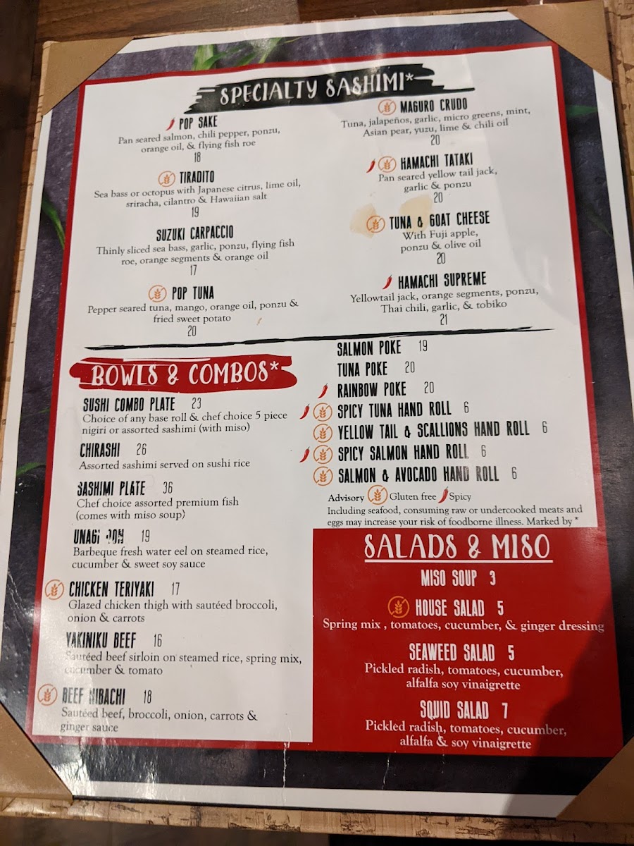 Yellowtail jack, cucumber, cilantro, topped w/ avocado, jalapenos, sriracha & lime oil. (Gluten Free)